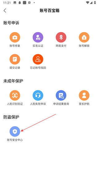 2、通过账号百宝箱可以看到账号申诉、未成年保护、防盗保护等,点击防盗保护分类的账号安全中心