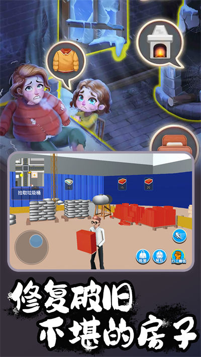 室内装修模拟游戏是一款简单有趣的模拟经营游戏,游戏里有一栋非常破旧的房子,玩家要做的就是打工赚钱,将房子重新装修,让老婆孩子过上好生活,不用再为住在哪里发愁,游戏的玩法很轻松,你能给家人打造一个温暖幸福的家吗。