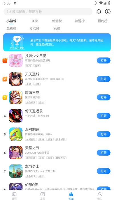 3、在榜单这里可以看到各种云游戏分类的榜单,你可以在这看到小游戏、新游戏等排行;