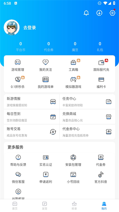 4、在这里可以对于自己的账号进行管理,查看下载的历史游戏、工具箱等等都可以从中找到。