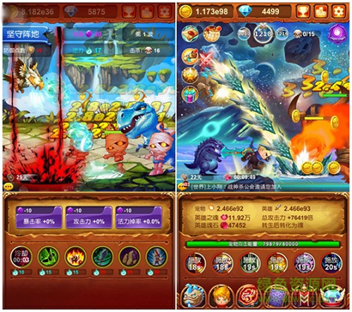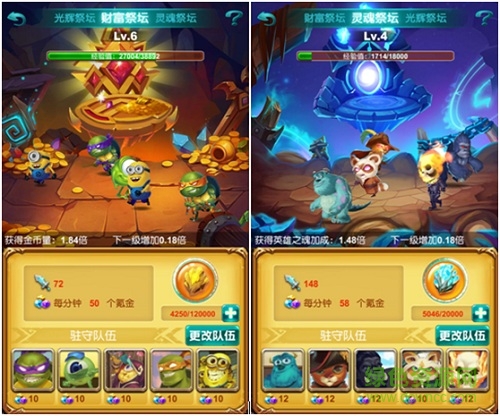首先是祭坛玩法,游戏中分为财富、灵魂、光辉三个祭坛,产出各不相同,分别从金钱、英雄之魂及圣光三个方面降低游戏难度。可通过宠物驻守获得相应资源提升祭坛等级,祭坛的等级越高获得的效果将成倍增长。当祭坛达到8级之后将开启掠夺玩法,资源掠夺需要你的魔宠参与战斗。