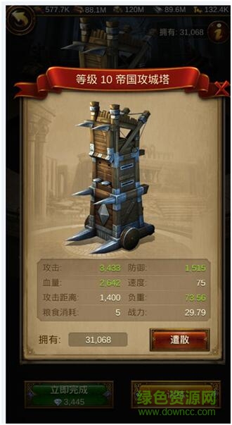 攻城器械攻击距离最远,负重高,适合远程打击一切部队,在攻击对方城池、掠夺对方资源时可以发挥出极大的优势!