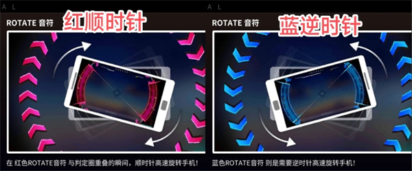 4、红色音符,无需点按,需要旋转手机与判定区域对齐通过即判定成功 (图三,进阶按钮,高难度一般会与其他音符同时出现,同时满足条件即可)