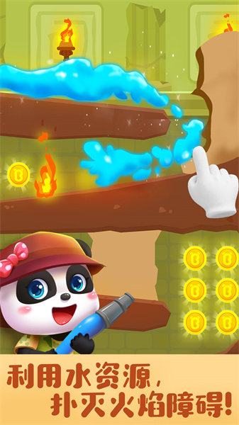 除了可以运用物理知识“引水”通关,宝宝们还可以寻找闯关道具来助力。石块挡住了水的流动路径,这可怎么办呢?小小地雷来帮忙。引水启动,砰!一定范围内的障碍物全部消失啦。还有手动操作的移动容器、水车机关……宝宝们,都来解锁试试吧。