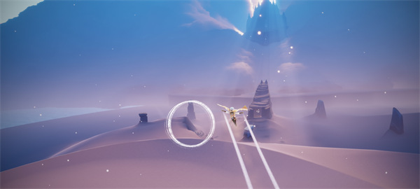 3、穿过三栋之后,玩家将会到一个悬崖边,在悬崖边往左边走,可以看到左边会有天上神庙洒下来的光束;
