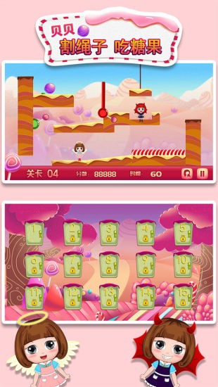 贝贝割绳子吃糖果是一款儿童益智休闲的免费软件,熟悉的玩法,综合了智力考验、脑筋急转弯、解谜等、想要顺利的吃到糖果可没那么简单哦、想要挑战一下吗?看看你割绳子后能不能顺利的吃到糖果。