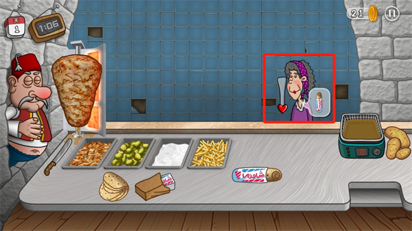 3、将自己的沙威玛移动给需要的顾客,并需要在顾客的耐心耗尽之前进行食物提供;