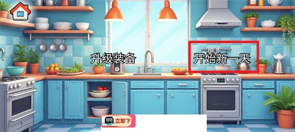 3、进入厨房只有两个选项,一个升级装备,但是现在还没钱升级,只能点击【开启新一天】去接待顾客赚钱;