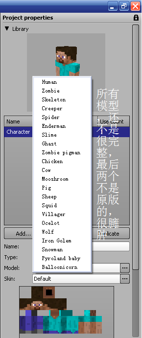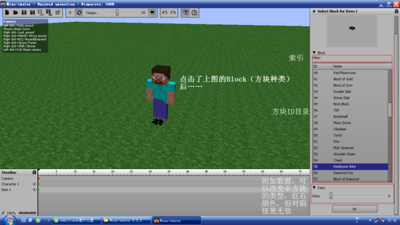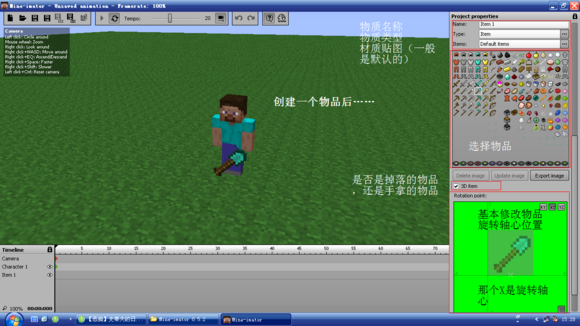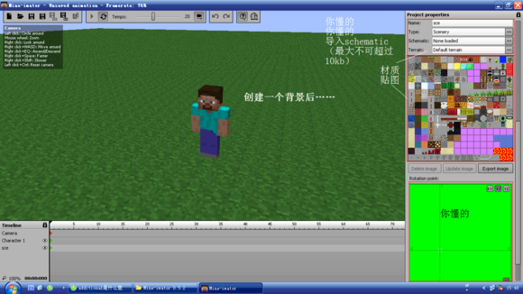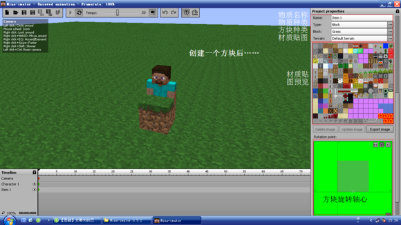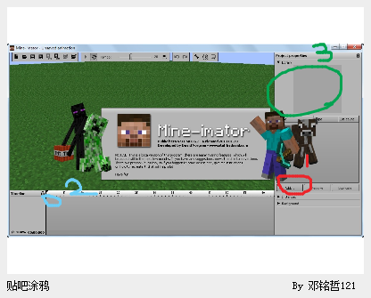 这个软件的形式和Flash差不多~分成主画面、时间轴和侧边栏。唯一不同的是,Flash是2D,Mine-imator是3D,而且是专门制作MC动画/视频的!