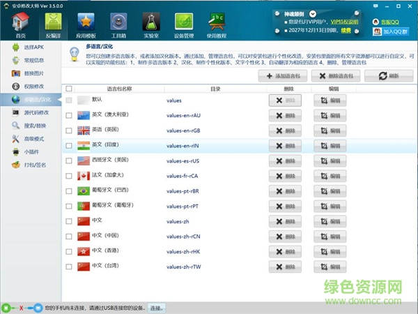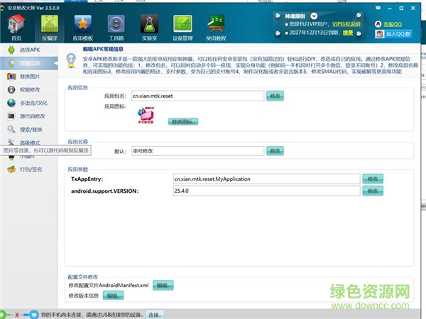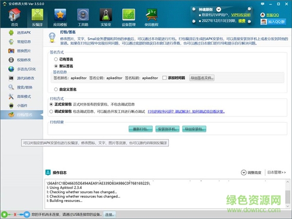 自由定制任何没有加固过的APK安装包,可以修改应用程序图标和应用程序名称、替换界面吗上面的任何文字和图片、翻译或者汉化制作多语言版本,更支持通过高级的SMALI代码,实现对应用软件的。