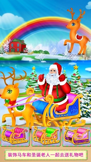 首先,你需要装扮圣诞老人的驯鹿车。用各种各样的饰品来装扮驯鹿和车子。游戏每完成一步,你都会得到一座奖杯。
