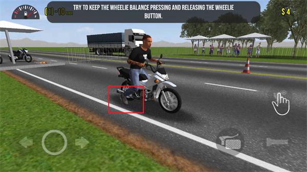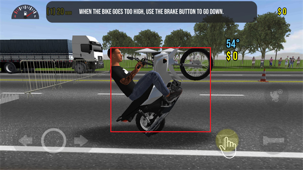 3、还可以点击屏幕下方红色框框内的刹车按钮,以紧急的进行摩托车的控制,以避免翻车;