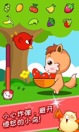 儿童宝宝接水果游戏中可以通过各种小游戏让玩家认识水果,茂密的大树上有很多水果,在掉落的过程中玩家需要尽可能多的接住水果哦,但是千万不要接炸弹,同时还需要躲避随时可能出现的小鸟,欢迎感兴趣的朋友下载体验!