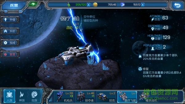 医疗飞船:是人族特有的治疗单位,由于是空中单位,平时还能充当空中肉盾作用。