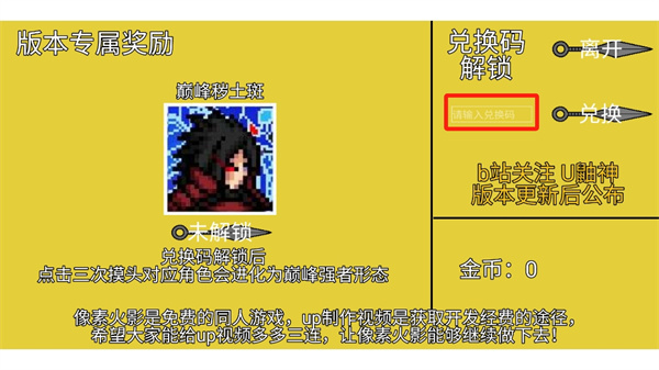 3、然后在兑换码解锁的下方输入兑换码【虫虫助手玩】就可以成功兑换巅峰秽土斑,可以使用这样一个强大的角色;