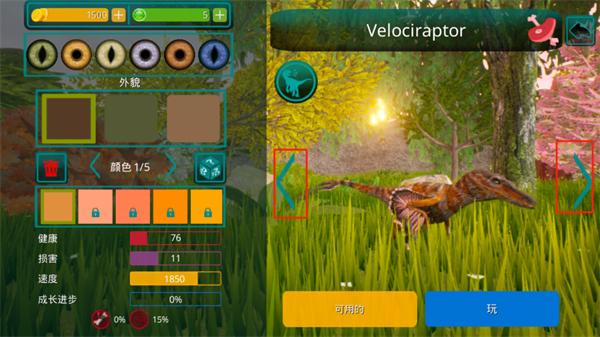 1、进入到场景内之后,玩家需要给自己的恐龙进行皮肤颜色或者是瞳孔颜色的选择,在屏幕左侧;