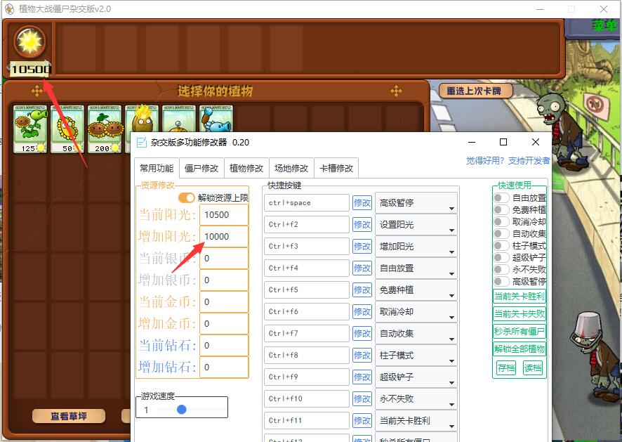3、进入关卡后,在修改器界面修改自己想要修改的数据,比如阳光,设定为增加10000后,按“enter”键确认,就可以看到游戏中阳光变成10500了。