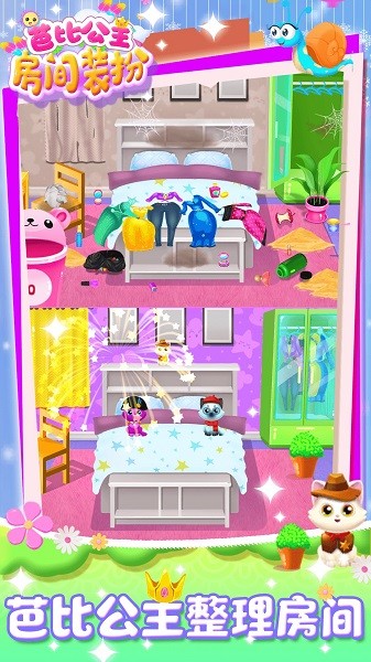 让芭比公主闪亮今晚的舞会!欢迎来到芭比公主房间装扮!芭比公主即将在家要举办舞会,但是现在她的房子比较脏乱,现在需要宝宝们的帮助!