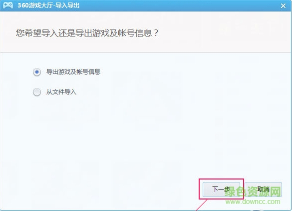 2.打开360游戏大厅导入导出界面,点击【导出游戏及账号信息】选项,然后点击【下一步】,选择您要备份的保存位置就可以了。