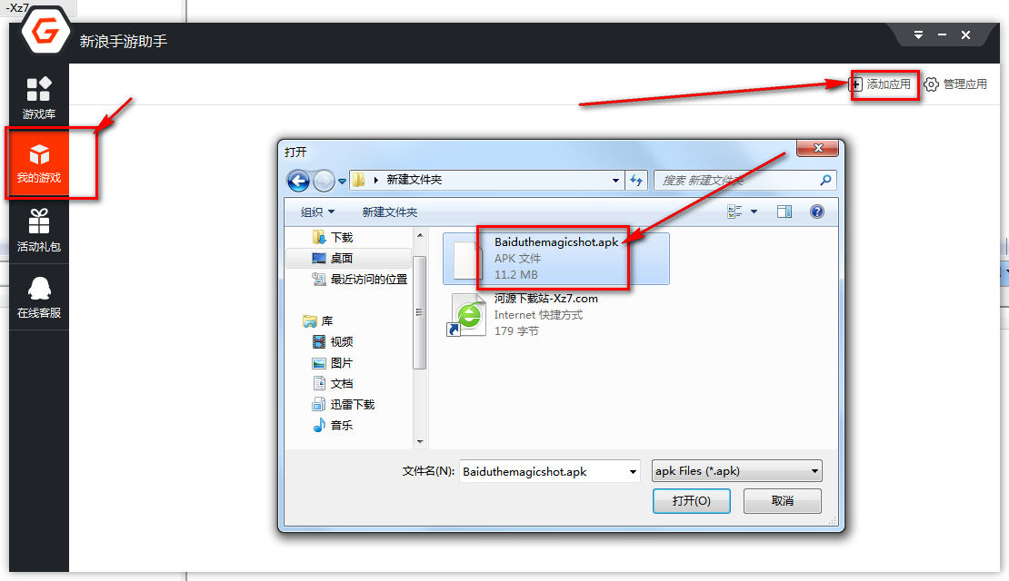 点左侧我的游戏--添加应用,然后选择电脑中已经下载好的安卓应用。