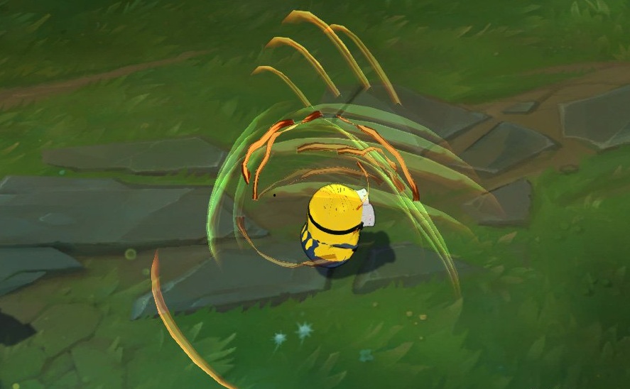 Q技能的木乃伊的绷带,现在已经成了小黄恩的黄色丝带,黄色丝带的颜色和小黄人的颜色非常搭配。