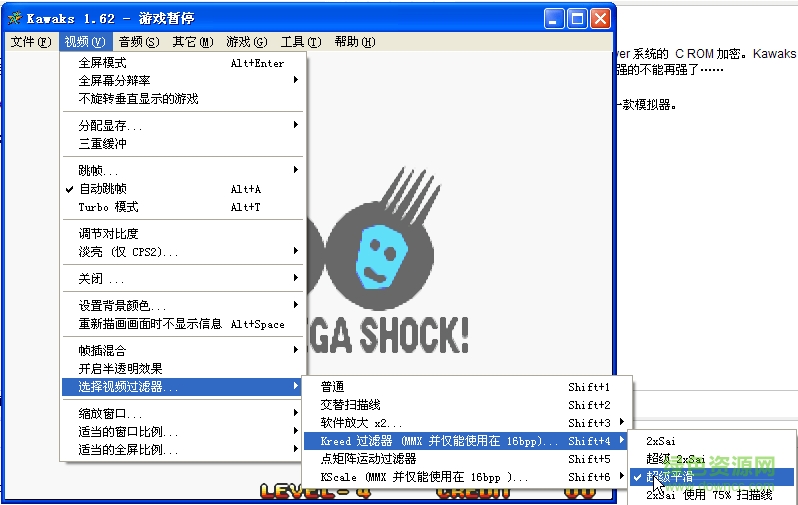 在模拟器菜单: 视频 -> 选择视频过滤器 -> Kreed过滤器 -> 超级平滑