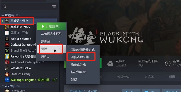 2、然后我们在Steam中找到【黑神话悟空-管理-浏览本地文件】,进入到黑神话悟空的根目录中;