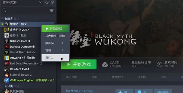 5、要启用加载模组,就需要在Steam中右键黑神话悟空,点击其中的【属性】进入其中;