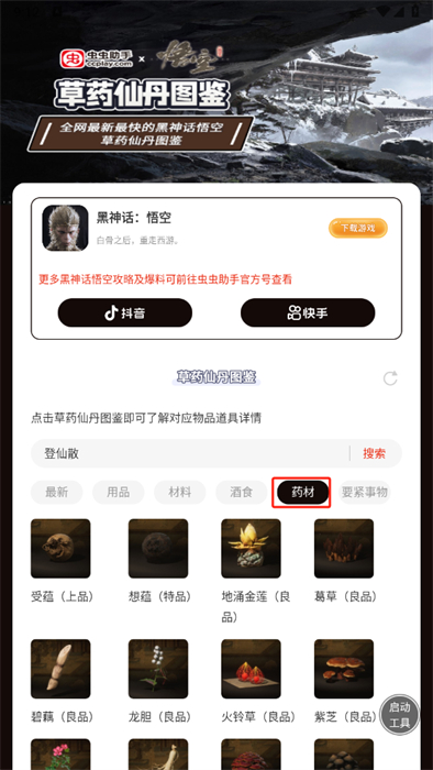 黑神话悟空草药仙丹图鉴游戏是一款针对黑神话悟空而制作的游戏辅助性软件,该软件内置了游戏中的不同仙丹以及草药的图鉴,可以供玩家们快速的了解清楚不同药品仙丹有着何种的功效以及用途,同时,软件还将会详细的介绍清楚这些药品仙丹的出处以及具体的获取方式,对于不熟悉玩法的玩家们有着较好的助力效果,此外,软件的分类也是十分的详细,可以帮助玩家们快速的找到对应的仙丹。