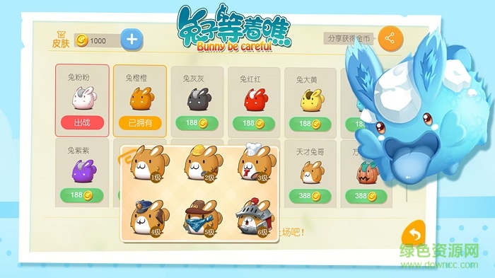 超级激萌可爱的兔兔形象,比拟真实玩偶的皮肤特质,超多皮肤可供选择,每次升级自动变换形象的良心设计!