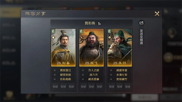 推荐理由:25级之后成型,刘备可以保持整个队伍的坦度,然后使用张飞和关羽之间的战法联动,可以造成伤害的同时,施加控制的效果。