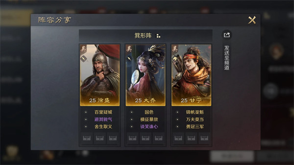 推荐理由:徐盛可以为小队提供高额的免伤,大乔能够稳定治疗,还可以为小队增加伤害,而甘宁则是可以在前几回合中叠加普伤结束战斗。