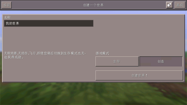 4、最后我们只需要选择生存模式还是创造模式,就可以完成设定,然后点击【创建新世界】进入到像素世界中。