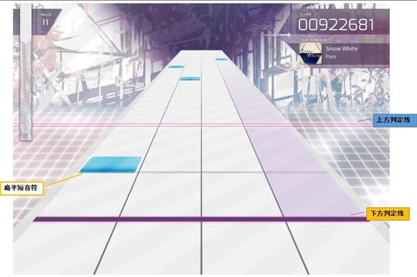 3、在长音符出也有历史和扁平,遇到扁平长条形的音符时,需要从音符头一直长按至音符尾并以下方判定线为准