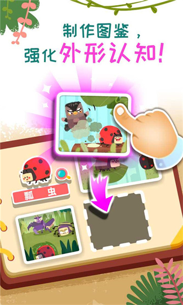 宝宝认知昆虫外形!成功找到昆虫,获得贴纸。宝宝根据昆虫外形,动手又动脑,完成拼图。拼图里面还有惊喜等宝宝发现哦!