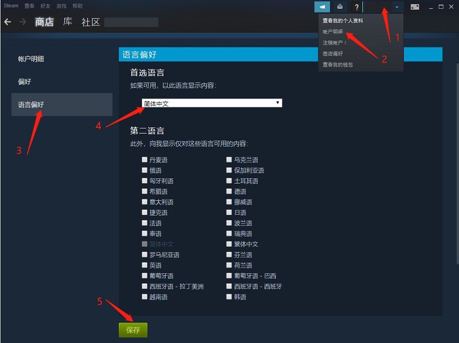 使用其他steam帐号登录steam,然后在“帐户明细”-“语言偏好”中将语言设置为简体中文或英文,保存即可,参见下图;