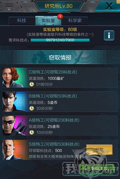 想获取更高等级科技,必须先提升实验室等级,那么,这时候,就需要科技点数的累积了!不过,科技点数可不是类似资源那样自动生产就有的,想获取科技点数,还得靠每天的派遣不同等级特工去“窃取情报”!作为奖赏,窃取情报还将有几率触发一系列神秘特殊事件,为玩家提供额外的强力道具喔!