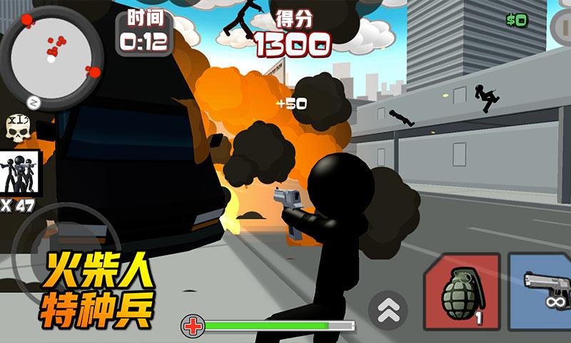 熟悉的火柴人形象,为你演绎一场射击生存之战,你将控制火柴人进行一系列的射击行动,击杀所有的恐怖分子来完成你特种兵的任务,游戏中你需要在规定的时间内消灭更多的敌人不断获取金币来解锁新玩法。