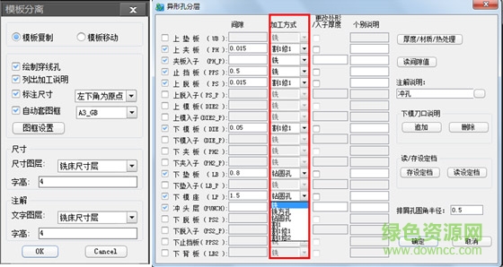 模具总装图绘制完成后,可自动拆分出模板图,绘制穿孔、列出加工说明、标注模板尺寸、以及自动套图框。