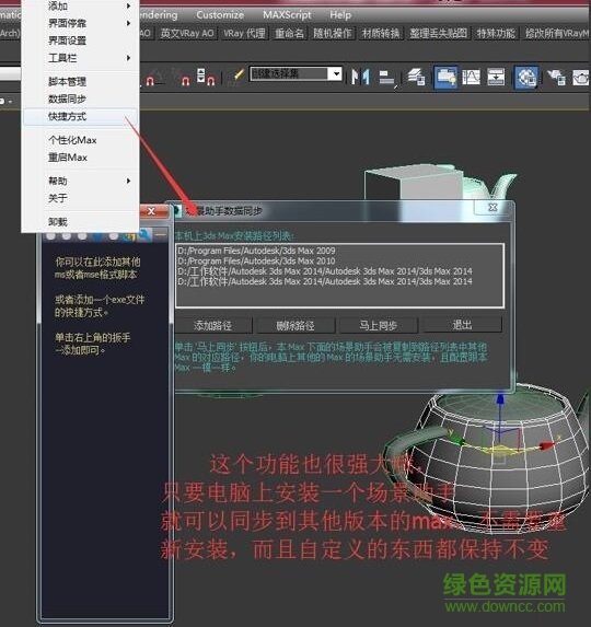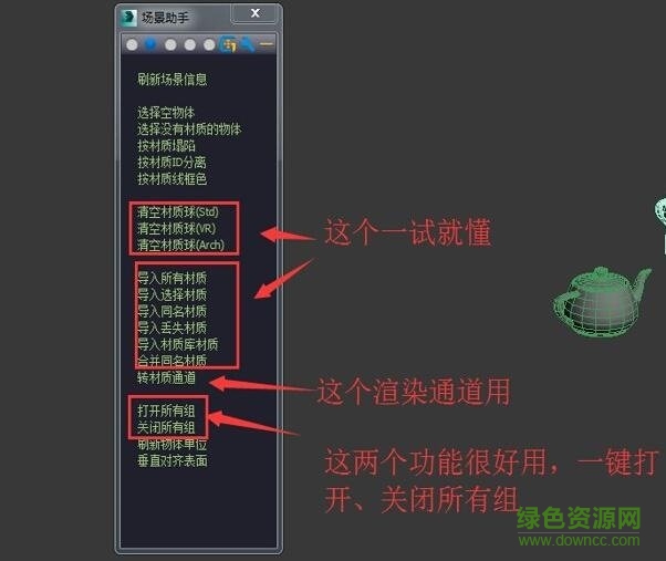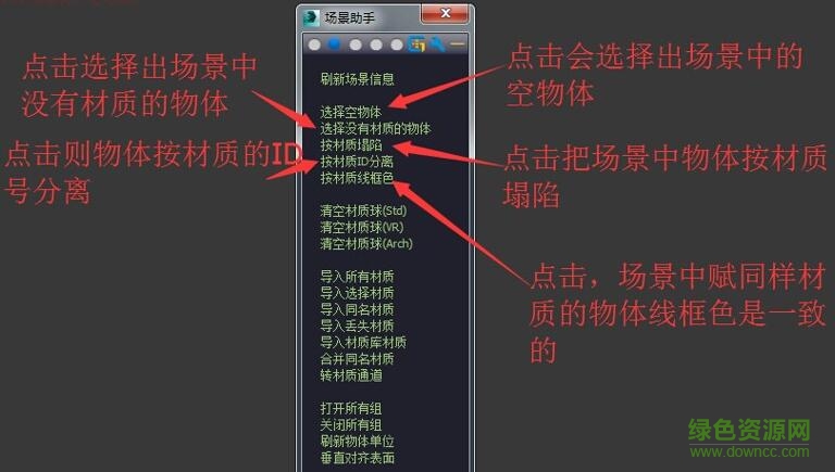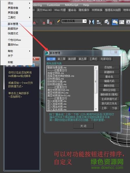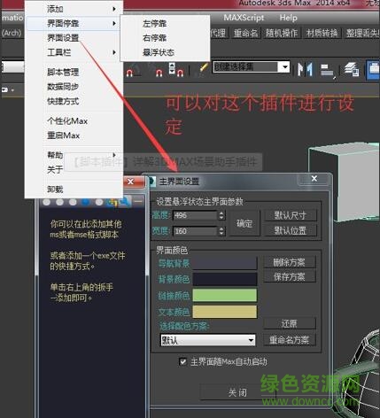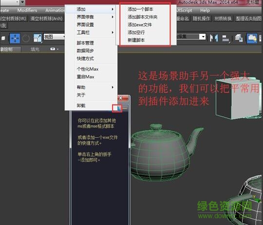 6.选项栏可以用来添加插件到场景助手里,绿色资源网提供了不少3dmax插件
