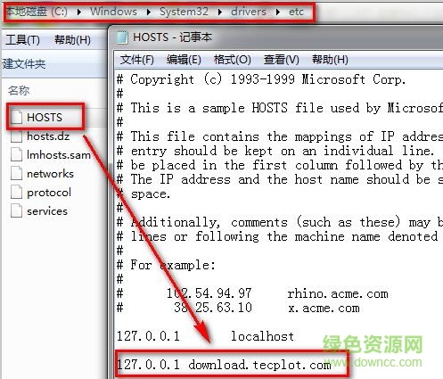9.右键用记事本打开hosts文件(hosts位于\Windows\System32\drivers\etc),在最后加上127.0.0.1 download.tecplot.com,然后保存