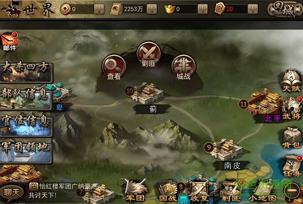 主公等级达到15级开放国战功能,玩家以军团势力为单位争夺世界地图中的城池。