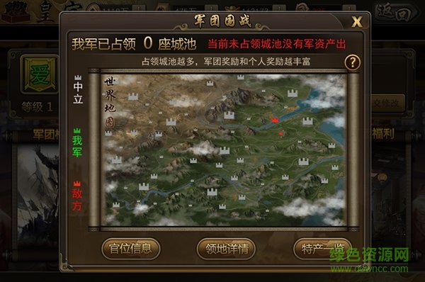 3.城池定时产出各类资源,占领城池的军团全体成员均可领取