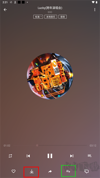 4、点击图片中的红框即可下载音乐,点击绿框可以收藏音乐