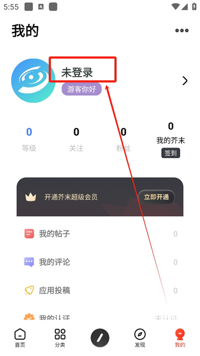 2、在个人空间点击上方的【未登录】进入到登录账号的界面;