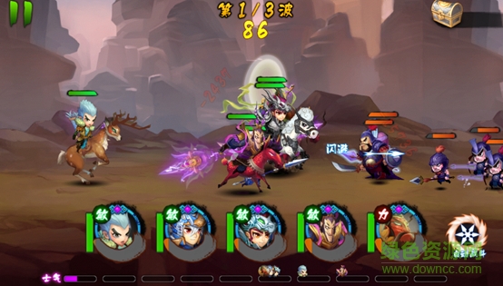 进入战斗加载画面, “三英战吕布” 的三国经典桥段跃然图上,仿佛带你穿越历史,回到汉末群雄四起的三国时代,参与乱世纷争,坐拥盛世江山。通过国漫画风表现手法的刻画,将刘备的城府极深、关羽的骄傲狂妄、张飞的粗犷善战、吕布的自负易怒,四人的性格特征表现得淋漓尽致。 由此可见,游戏制作方在美术功底以及人物形象的拿捏上实力不俗。而使用“三英战吕布”的加载画面,也表现出游戏遵循原著,传达着极具激斗爽快的游戏乐趣。