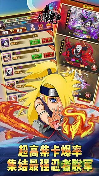 《忍者镇魂曲》是一款颠覆传统卡牌游戏战斗体验的手游。集培养、强化、竞技、夺宝等流行元素融一体。流畅炫酷的忍术释放,绝对会让你流连忘返;忍刀七人众、佩恩六道、五代火影……点亮羁绊与主角一起担负起拯救忍界的重任!《忍者镇魂曲》绝对让你爱不释手!