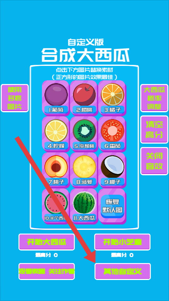 1.可以自定义的合成大西瓜,你可以把里面的各种水果的图片轻松换成其他素材啦。