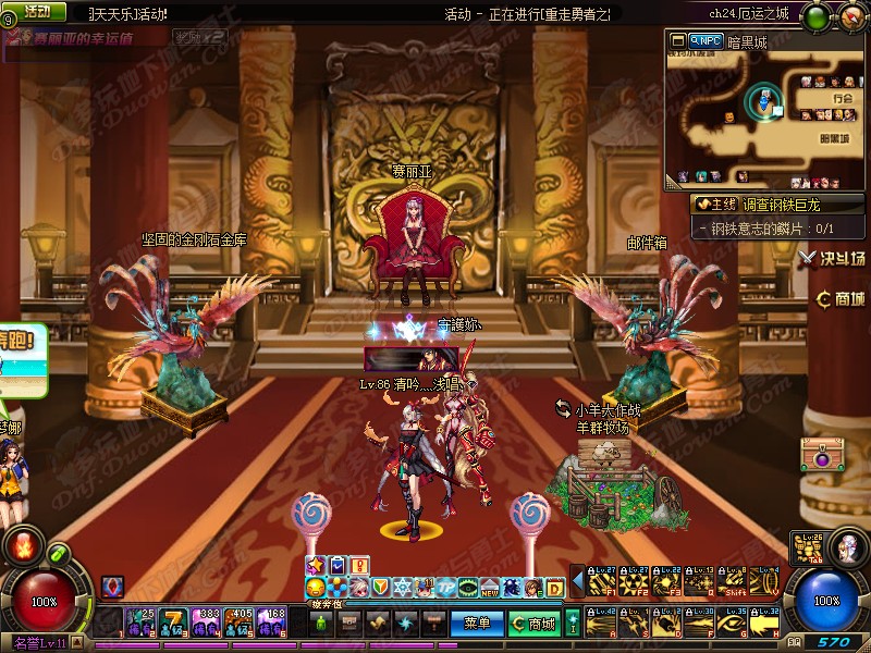 dnf中国风城镇补丁是一款制作精美的城镇美化补丁,进入游戏后你会发现赛利亚端坐在王位之上并且背景和两边的石柱上都雕刻了巨龙,而仓库和右键一左一右替换为2只凤凰,整个房屋中呈现一种大气澎湃的感觉,走出赛利亚的房间你也能看到各类古声古色的建筑,狮子石像、阶梯、牌匾、大红灯笼、阁楼、方桌....将大家带回美丽的中国风世界之中
