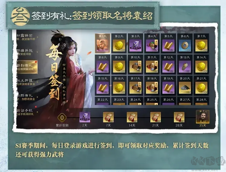 新玩家下载登陆游戏后,即可领取【橙色武将徐盛】、【黄金*288】、【求贤令*5】及【预约头像框】等豪华预约奖励;游戏初上线,新人签到累计解锁【橙色武将袁绍】、【求贤令】、【黄金】及大量养成资源;参与七日狂欢活动,还有【橙色武将孙策】、【自选橙色珍品战法】、【求贤令】等丰厚道具奖励。